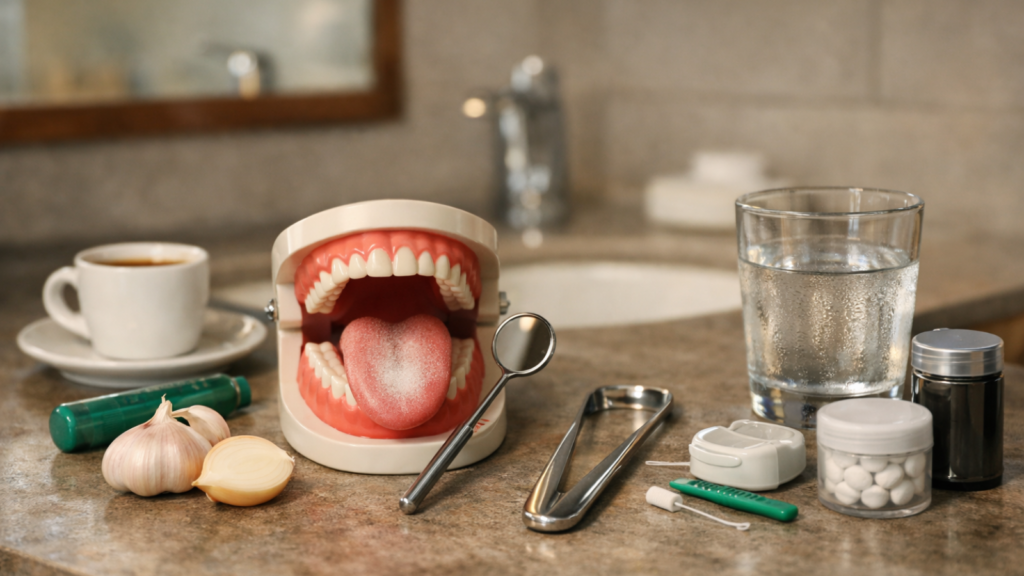 The belief that “everyone gets bad breath from food” conflates temporary dietary effects with chronic halitosis. Garlic, onions, coffee, and alcohol do produce noticeable breath changes, but these resolve within 24 to 48 hours as the compounds metabolize and clear from your system, and they affect everyone equally regardless of oral health status. Chronic halitosis persists on days you avoid these foods entirely and typically smells different (sulfurous rather than food-specific) from simple dietary breath. Similarly, the myth that “brushing teeth harder or more often” cures halitosis fails because most cases stem from tongue coating, gum pockets, or systemic factors that tooth-brushing doesn’t address, excessive brushing can damage gums and enamel while leaving the actual odor source untouched.