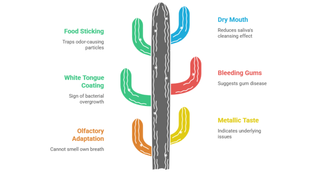 Persistent metallic taste, thick white tongue coating, bleeding gums during brushing, and chronic dry mouth serve as reliable indicators that correlate with detectable halitosis in 70% of cases. You cannot accurately smell your own breath because your olfactory system adapts to constant odors within 2 to 5 minutes, making the only reliable self-test asking a trusted person to assess your breath at different times of day or scraping your tongue with a spoon and smelling the collected material.