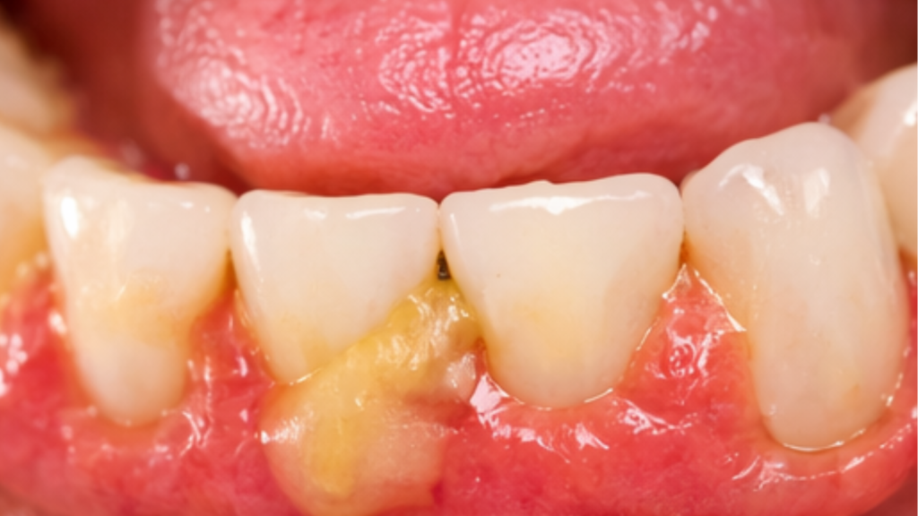 - Pus discharge: white or yellow fluid oozing from the gumline or between teeth