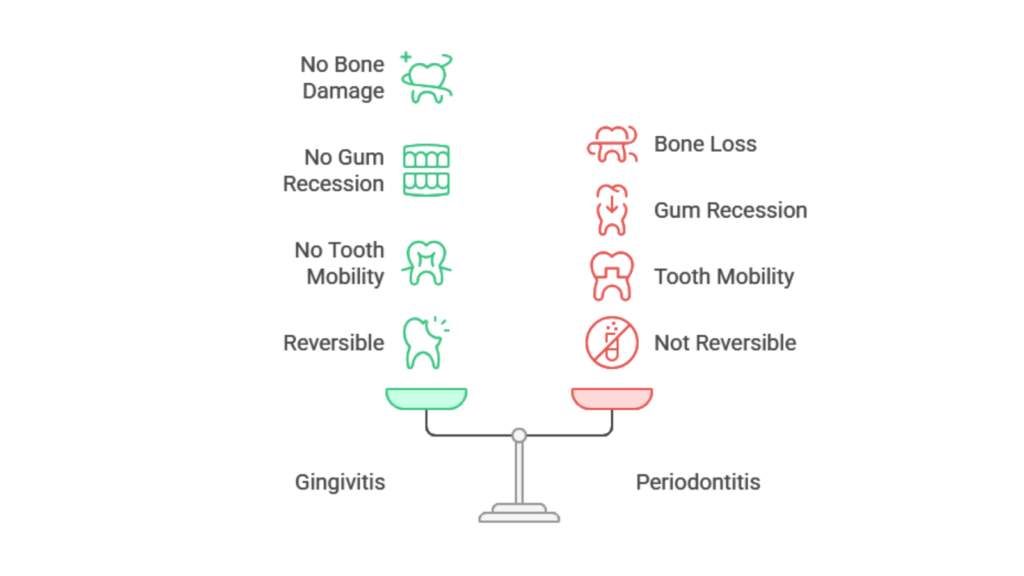 Gingivitis is reversible gum inflammation without bone damage, characterized by redness, swelling, and bleeding that resolve within 1 to 2 weeks after professional cleaning. Periodontitis develops when inflammation destroys the bone and ligament supporting teeth, creating deep pockets, gum recession, and eventual tooth mobility. Ignoring early bleeding allows silent progression from bad breath to bone loss to tooth loss over months or years, making early intervention critical.