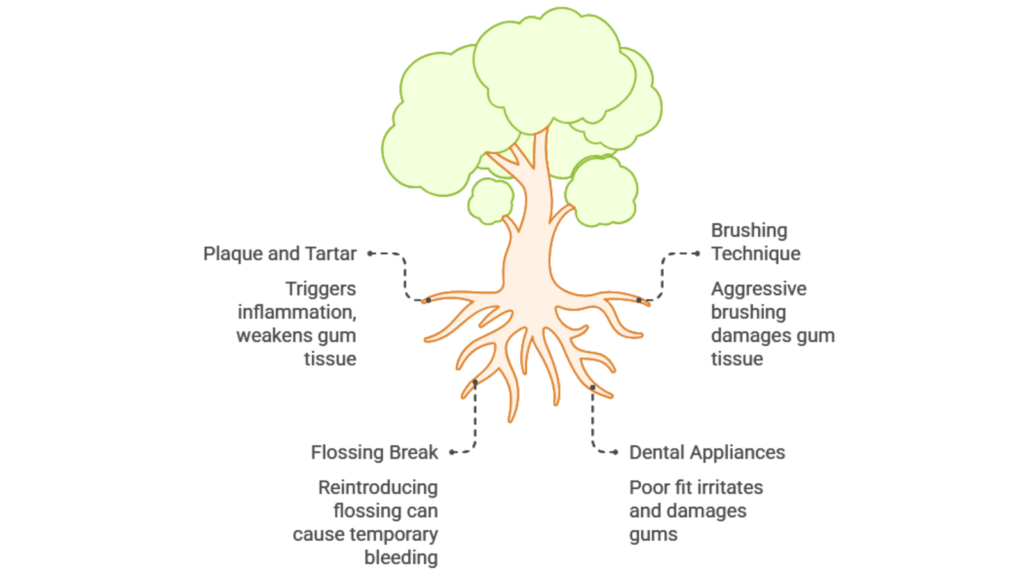Plaque and tartar buildup along the gumline cause most cases of bleeding gums by triggering inflammation that weakens tissue. Technique errors like brushing too hard, gaps in flossing routines, and poorly fitting dental appliances also contribute to localized bleeding. Medical factors such as pregnancy hormones, uncontrolled diabetes, vitamin deficiencies, and blood-thinning medications can amplify bleeding or slow healing even when oral hygiene improves. The dental causes are: