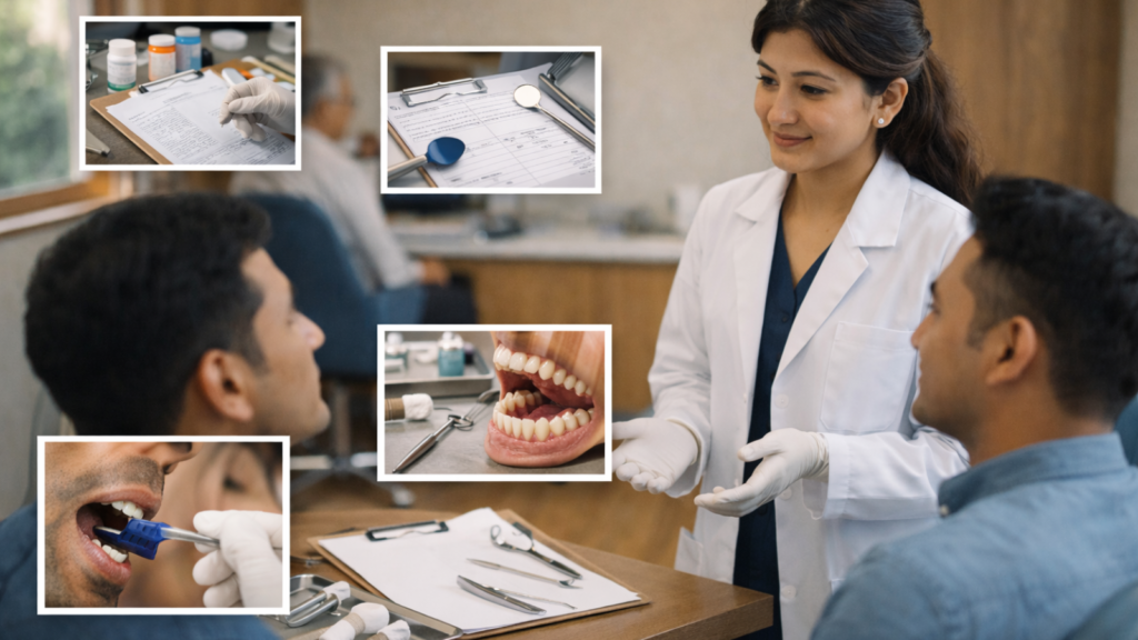 The visit usually starts with your medical history and risk factors because health conditions and medications can affect your mouth and healing. Then the dentist does a tooth-by-tooth exam to check for decay, old filling issues, cracks, sensitivity triggers, and bite problems. Your gums are assessed for bleeding, swelling, and pocket depth to spot early gum disease. A soft-tissue check is also done to examine the tongue, cheeks, and throat for ulcers, infection signs, and unusual changes.