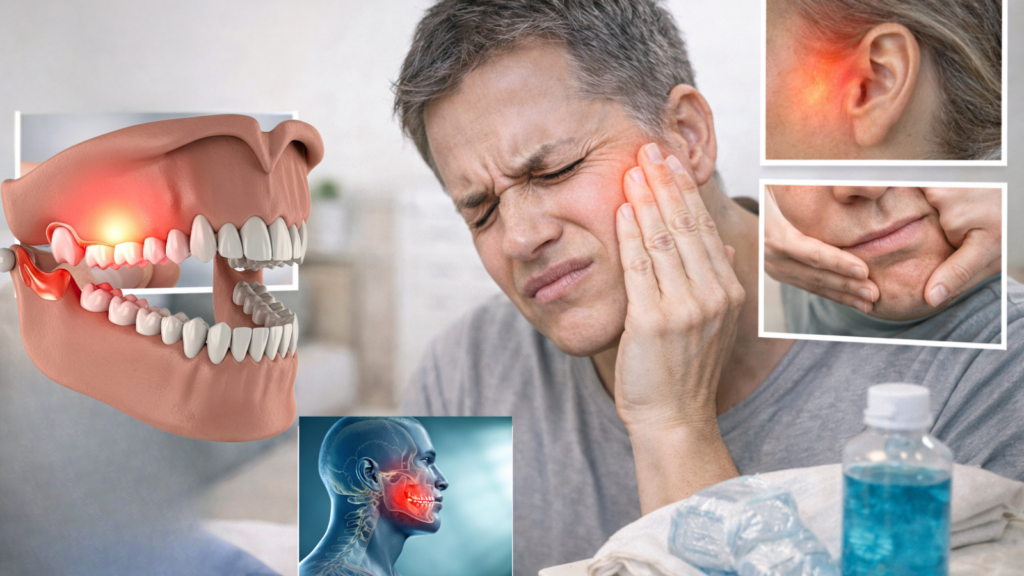 Differentiating TMJ disorders from dental infections requires checking specific signs. Tooth infections create constant, throbbing pain localized to one or more teeth, often worsening with hot/cold exposure. The tooth feels “high” when you bite, and tapping it reproduces sharp pain. TMJ pain worsens with jaw movement but does not localize to specific teeth, and temperature sensitivity does not occur.
