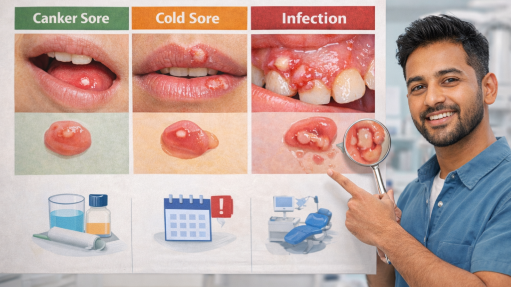 This guide helps you tell the difference between canker sores, cold sores, infection-related ulcers, and explains the red flags that mean you shouldn’t wait. You’ll learn quick identification tips based on location, appearance, and healing time, plus what you can do at home for relief. If you’re in Kathmandu, we’ll also cover when to see a dentist and what to expect during an exam.