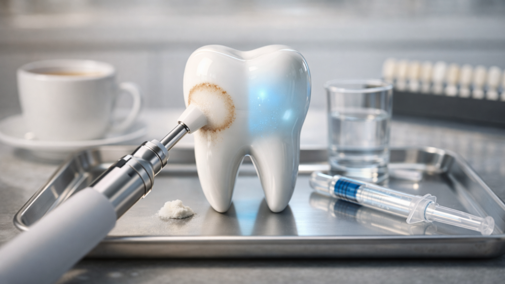 Professional polishing removes surface stains and restores natural brightness without chemicals. The hygienist uses a rubber cup or air polisher with fine pumice or bicarbonate powder. This mechanical cleaning eliminates coffee rings, tea stains, and soft plaque deposits. Polishing costs NPR 1,000 to 1,500 as an add-on to regular cleaning and produces immediate visible improvement for surface-stained teeth.