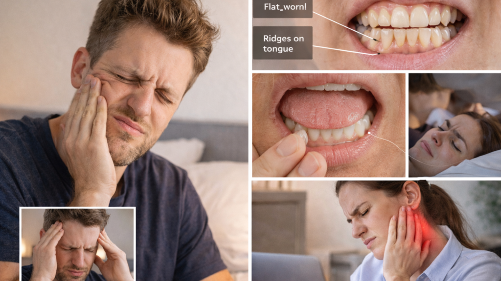 Many people first notice bruxism through morning jaw tightness, headaches, tooth sensitivity, or facial muscle fatigue. Your dentist may spot flat wear marks, tiny cracks, or ridges on the cheeks/tongue that suggest clenching. If you have sharp pain on chewing, swelling, or jaw locking, you should get checked quickly to rule out cracks or TMJ inflammation.